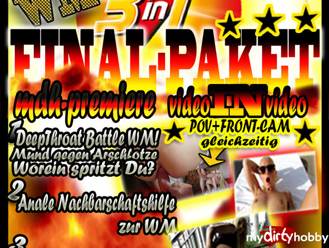 Finalpaket:GEWINNE GLEICH 3 VIDEOS AUF EINMAL !!Meine Fickerlebnisse im WM Monat!.Das erste Video ist eine MDH-Premiere -DEEPTHROAT-BATTLE,ARSCH GEGEN MUND, fick mich abwechselnd so wie du willst und finde Heraus wo DU reinspritzt! 🙂 natürlich VideoINVideo :Der erste Screenshot ist Original aus dem Video.Erlebe POV und Front-Perspektive Gleichzeitig!Schau dir POV an, wie ich geil gefickt werde und sehe gleichzeitig wie ich stöhne! Deepthroat Garantie 😉 Dabei noch etwas orakelt! Mein Arsch Für DEUTSCHLAND gilt natürlich immernoch! Wo ist er wohl gekommen?Beim 2)Video in der WM-Zeit gab ich Anale Nachbarschaftshilfe zur WM 🙂 Schau wie ich dem Nachbar 😀 auf HighHeels und im Bikini öffne und er gleich ganz spitz wurde…Er fickte mich Dirty in den Arsch, wie hat er das bloß geschafft?:) Zu lustig der Kerl! Das 3)Video hat es in sich, VERSPROCHEN mit Überraschung und alles was dazu gehört! Aber nicht zu viel verraten, sei gespannt, was passiert! :)ALSO MEINE LIEBEN: TIPPEN LOHNT SICH!